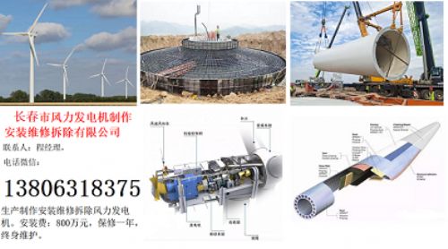 长春市风力发电机制作安装维修拆除有限公司,联系人:程经理,电话微信:13806318375.生产制作安装维修拆除风力发电机。安装费:800万元,保修一年,终身维护。对于风电场施工建设而言,发电机组的安装直接影响施工进度,下面小编以2MW/90m轮毂高度的风机为例,介绍一下风电机组安装的步骤:1、风电机组安装施工准备风机基础砼经过充分养护,强度达到设计要求,基础四周完全回填压实,并已办理移交验收后安装。通往安装现场的道路要平整,每个风机安装场地面积足够且场地平整,面积约为40m×60m,适合1台主力吊车和1台辅助吊车作业。主力吊车的站位在风机基础的主风方向或反向位置,辅助吊车根据作业需要站位。安装所需的吊装机械、吊装工具准备齐全,经检验合格后方可在工程上使用。到场的设备、零部件质量通过有关部门的验收并具有报告/合格证。吊装前应与气象部门进行联系,了解近期的天气情况,合理安排吊装时间。
